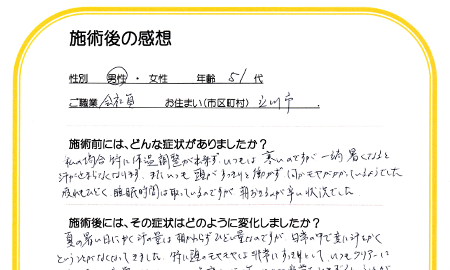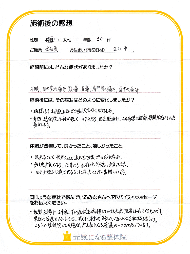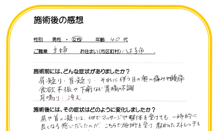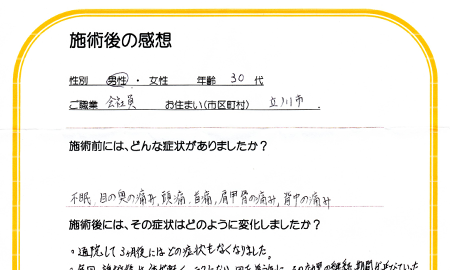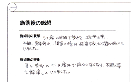 首と背中のコリや痛みが徐々になくなり、不眠等の症状も解消していきました。