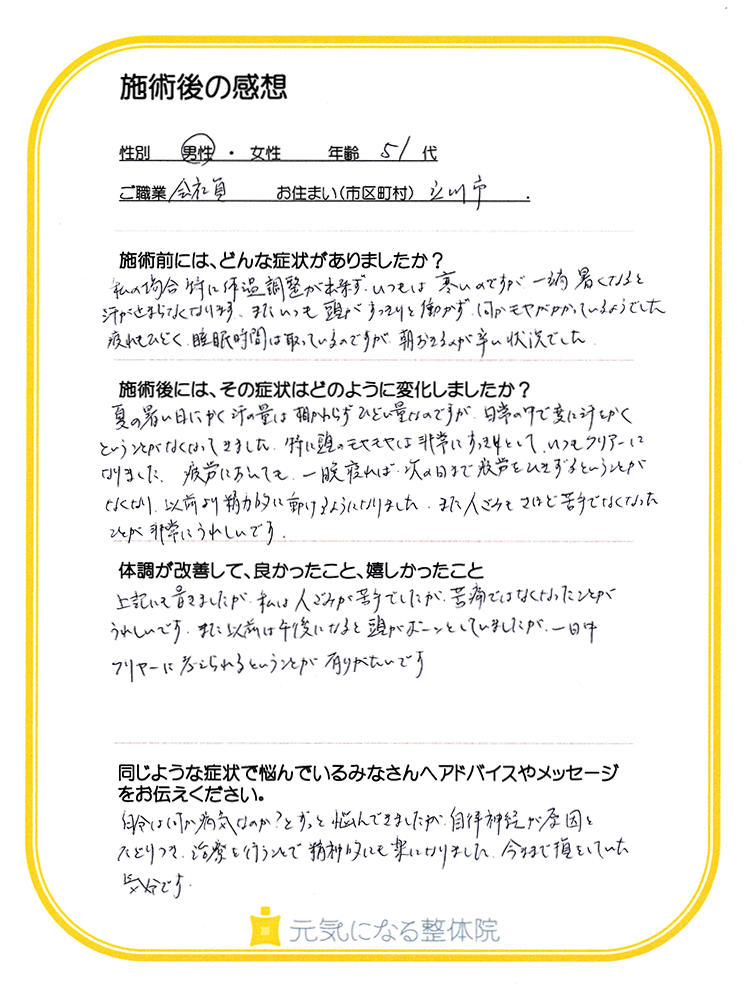 体調が改善して身体が楽になった分、考え方も明るくなり、仕事をしていても動きが良く、今までの症状の重さが嘘のように思えます。身体が楽になり、動き過ぎて体調が戻ってしまう事もあるくらい動けるようになりました。
