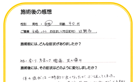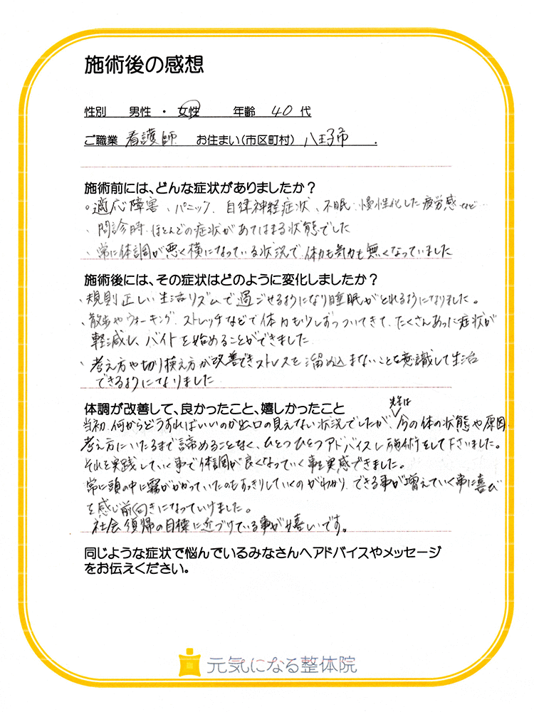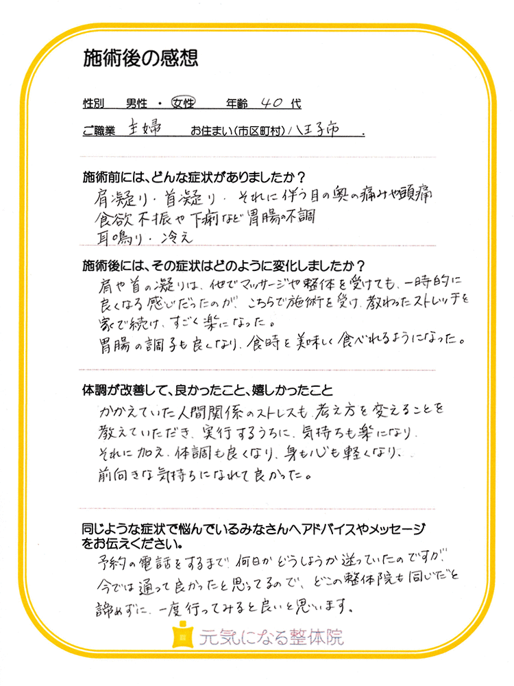 当初、何からどうすればいいのか出口の見えない状況でしたが、先生は今の体の状態や原因、考え方に至るまで諦めることなく、ひとつひとつアドバイスし施術をして下さいました。それを実践していく事で体調が良くなっていく事を実感できました。