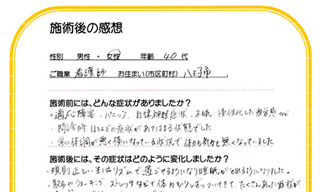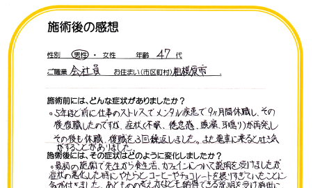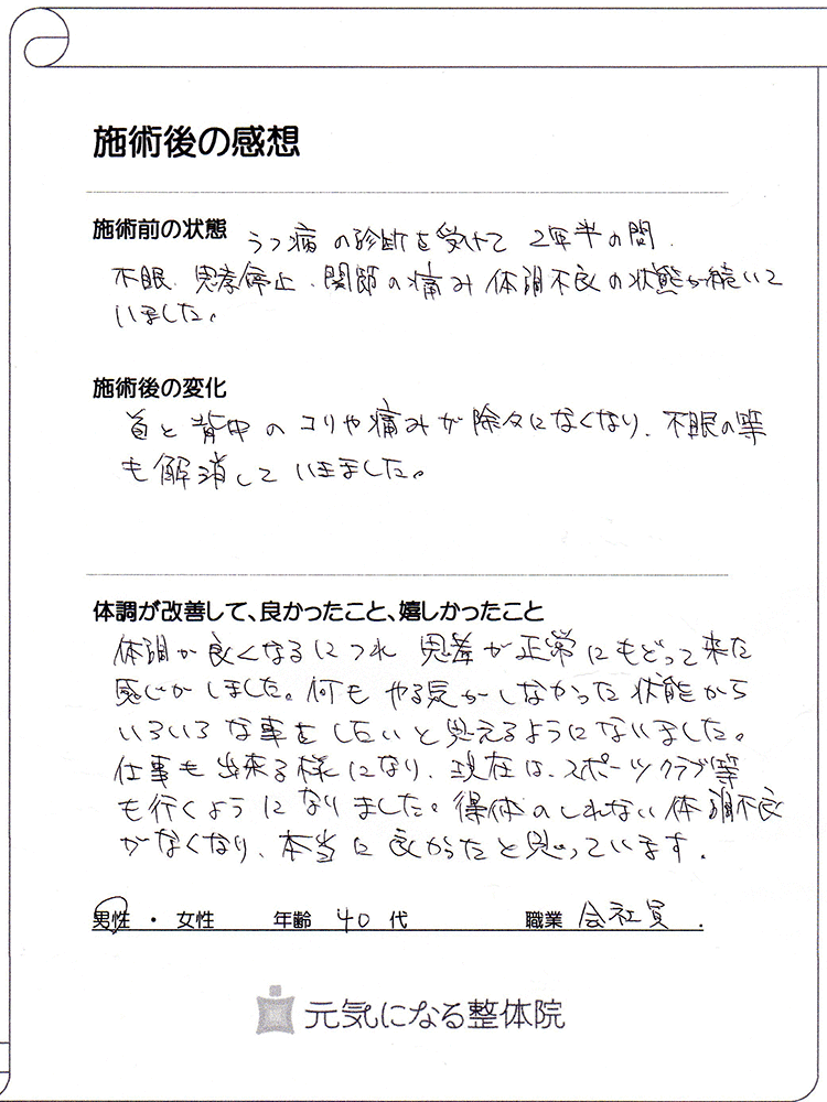 うつ病で休職してしまい、病院や他の施術院など、いろいろな所へ通院したが良くならずにいたそうです。