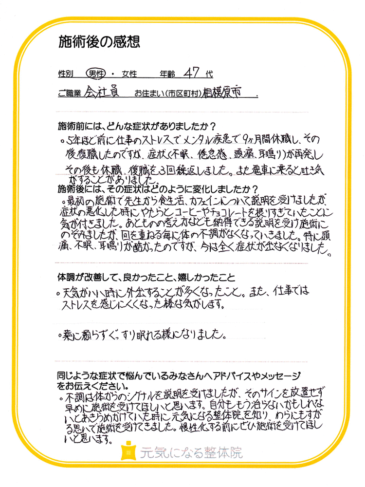 特に頭痛、不眠、耳鳴りが酷かったのですが、今は全く症状が出なくなりました。