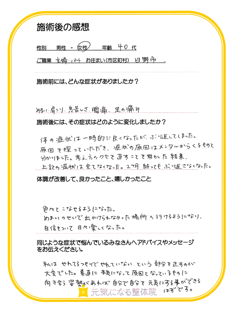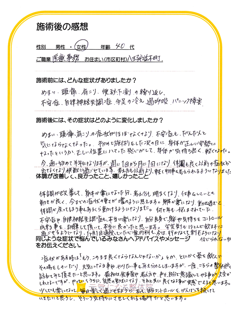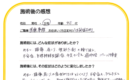 めまい、頭痛、肩こりの症状がほぼなくなり、不安症もだんだんと気にならなくなった。