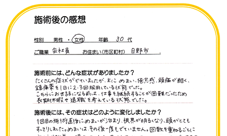 1回目の施術直後にめまいが治まり、視界が明るくなり、頭がとてもすっきりしました。めまいはその後一度も出ていません。回数を重ねるごとに症状が改善し、現在は1~2ヶ月に1回メンテナンスしていただいてます。