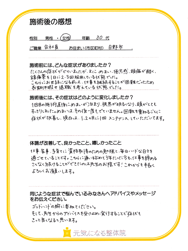 たくさんの症状がでていましたが、主にめまい・倦怠感・頭痛が酷く、鎮痛薬を1日に2~3回服用している状態でした。こちらのお世話になる前は、仕事を継続することが困難だったため、長期休暇や退職を考えている状態でした。