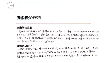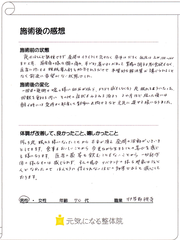 一回目の施術で嘘のように血圧が低下、ドキドキ感もしなくなり、夜眠れるようになった。回数を重ねるうちにその他の症状もみるみる治まり、3ヶ月ほど経った頃には朝6時に気持ちよく起床して散歩に出掛けるなど、元気に過ごせる様になりました。
